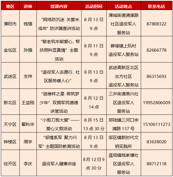 编者按 为认真贯彻落实习近平总书记关于退役军人工作的重要论述,将全市1070个退役军人服务中心(站)由“建起来”向“用起来”转变,自2024年1月15日起,全市退役军人服务保障系统为广大退役军人和人民群众提供各类服务项目。为进一步扩大活动范围和影响力,现已增加至6大类183小项,内容涉及政策宣传、生活健康、关心关爱、志愿服务、创业培训、体育竞赛等。每周三在“常州市退役军人事务局”微信公众号上发布下一周服务清单,热烈欢迎广大退役军人和人民群众前往参与。 8月11日(周一)至8月17日(周日)服务清单