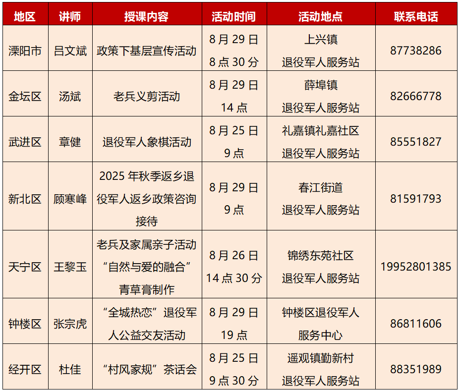 编者按 为认真贯彻落实习近平总书记关于退役军人工作的重要论述,将全市1070个退役军人服务中心(站)由“建起来”向“用起来”转变,自2024年1月15日起,全市退役军人服务保障系统为广大退役军人和人民群众提供各类服务项目。为进一步扩大活动范围和影响力,现已增加至6大类183小项,内容涉及政策宣传、生活健康、关心关爱、志愿服务、创业培训、体育竞赛等。每周三在“常州市退役军人事务局”微信公众号上发布下一周服务清单,热烈欢迎广大退役军人和人民群众前往参与。 8月25日(周一)至8月31日(周日)服务清单