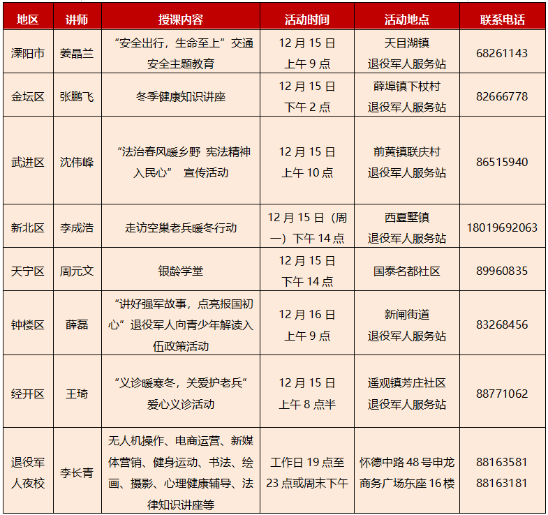 为认真贯彻落实习近平总书记关于退役军人工作的重要论述,将1065个退役军人服务中心(站)由“建起来”向“用起来”转变,全市退役军人服务保障系统为广大退役军人和人民群众提供政策宣传、生活健康、关心关爱、志愿服务、创业培训、体育竞赛等6大类183小项服务。自2025年8月1日起,新增退役军人夜校服务清单,由常州慧迪职业培训学校具体承办,课程涵盖无人机操作、电商运营、新媒体营销、书法、绘画、摄影、心理健康辅导、法律知识讲座等多领域,所开设的课程可向全市退役军人免收学费两门。每周三在“常州市退役军人事务局”微信公众号上发布下一周服务清单,热烈欢迎广大退役军人和人民群众前往参与。