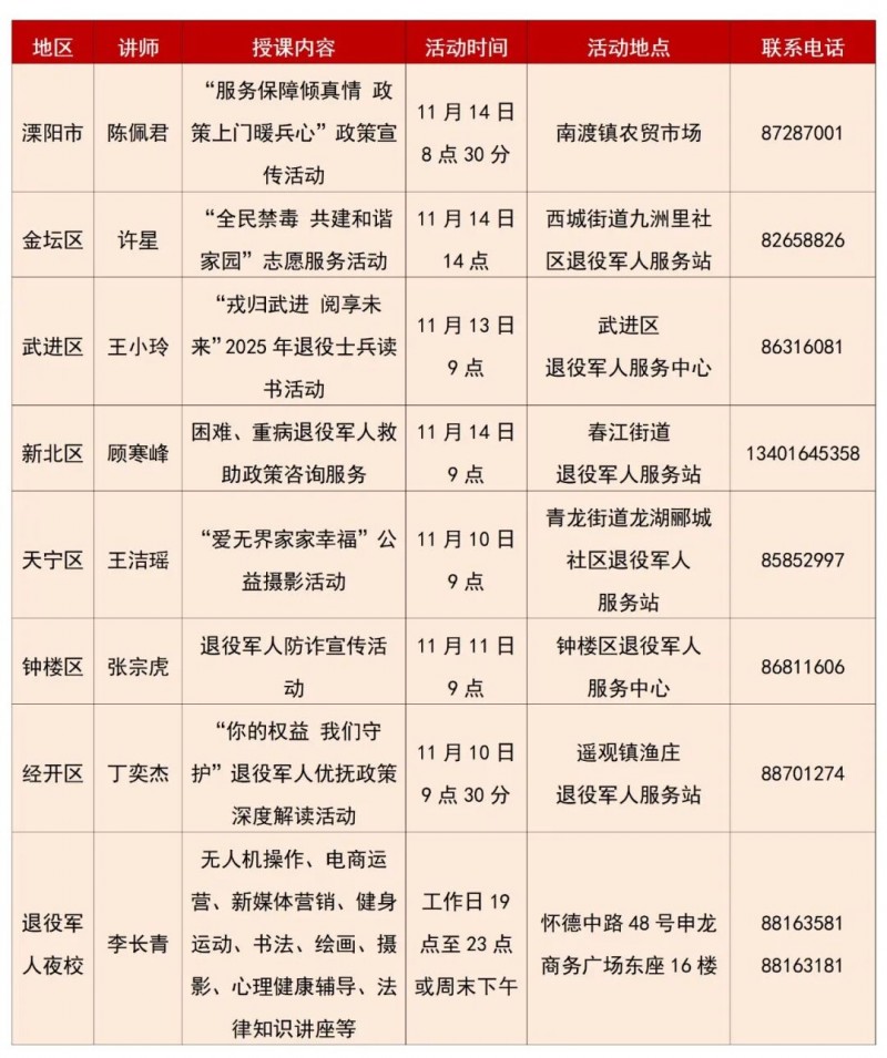 为认真贯彻落实习近平总书记关于退役军人工作的重要论述,将1065个退役军人服务中心(站)由“建起来”向“用起来”转变,全市退役军人服务保障系统为广大退役军人和人民群众提供政策宣传、生活健康、关心关爱、志愿服务、创业培训、体育竞赛等6大类183小项服务。自2025年8月1日起,新增退役军人夜校服务清单,由常州慧迪职业培训学校具体承办,课程涵盖无人机操作、电商运营、新媒体营销、书法、绘画、摄影、心理健康辅导、法律知识讲座等多领域,所开设的课程可向全市退役军人免收学费两门。每周三在“常州市退役军人事务局”微信公众号上发布下一周服务清单,热烈欢迎广大退役军人和人民群众前往参与。