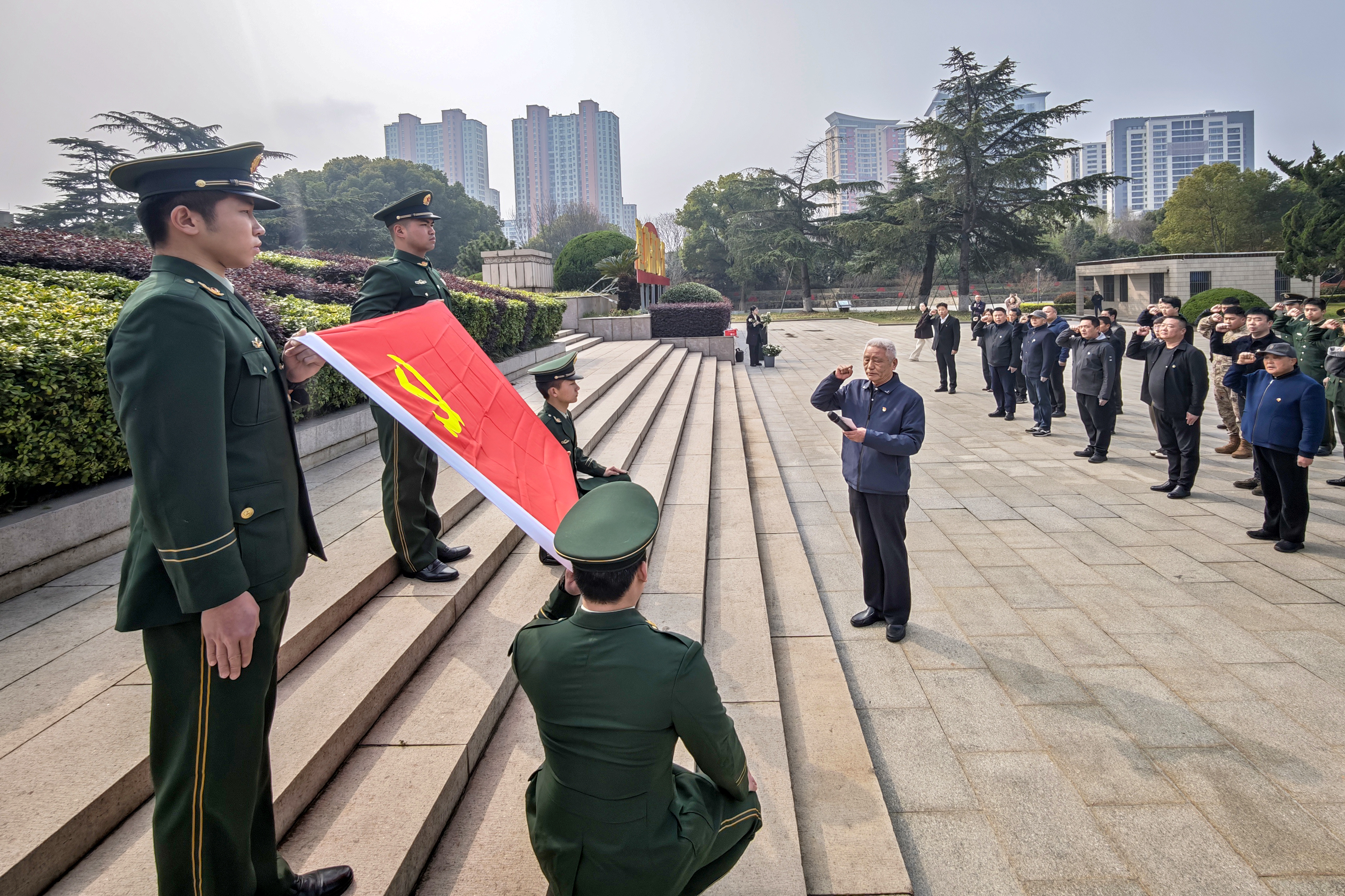 “我志愿加入中国共产党,拥护党的纲领,遵守党的章程……”在领誓人的带领下,全体党员面向鲜红的党旗,高举右拳,重温入党誓词,铿锵有力的誓言在陵园上空回荡,展现了钟楼退役军人“退役不褪色、永远跟党走”的坚定信念。随后,大家依次绕行纪念碑,瞻仰浮雕,轻轻献上手中的白菊,以最朴素的方式表达对英烈的崇敬之情。