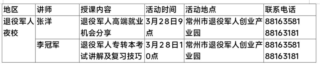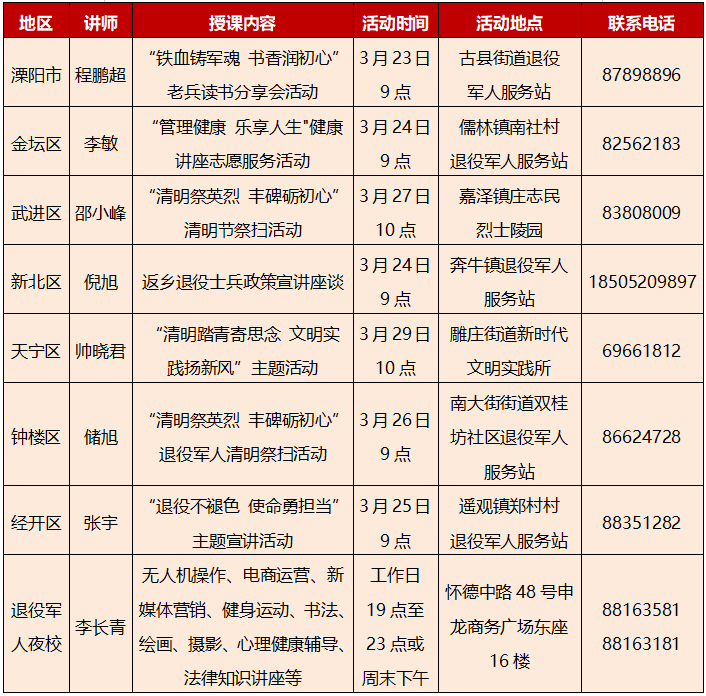 为认真贯彻落实习近平总书记关于退役军人工作的重要论述,将1065个退役军人服务中心(站)由“建起来”向“用起来”转变,全市退役军人服务保障系统为广大退役军人和人民群众提供政策宣传、生活健康、关心关爱、志愿服务、创业培训、体育竞赛等6大类183小项服务。自2025年8月1日起,新增退役军人夜校服务清单,由常州慧迪职业培训学校具体承办,课程涵盖无人机操作、电商运营、新媒体营销、书法、绘画、摄影、心理健康辅导、法律知识讲座等多领域,所开设的课程可向全市退役军人免收学费两门。每周三在“常州市退役军人事务局”微信公众号上发布下一周服务清单,热烈欢迎广大退役军人和人民群众前往参与。