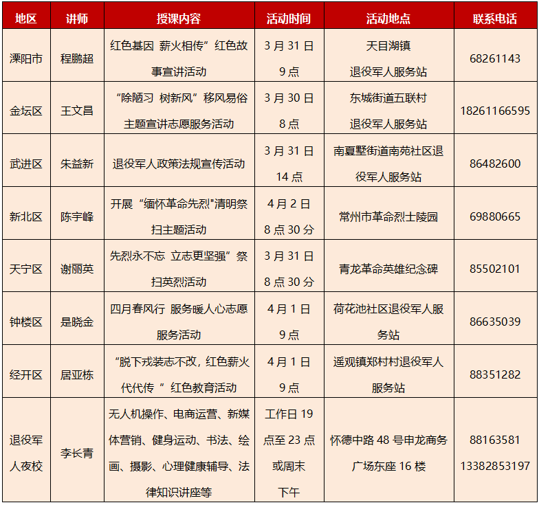 每周三在“常州市退役军人事务局”微信公众号上发布下一周服务清单,热烈欢迎广大退役军人和人民群众前往参与。